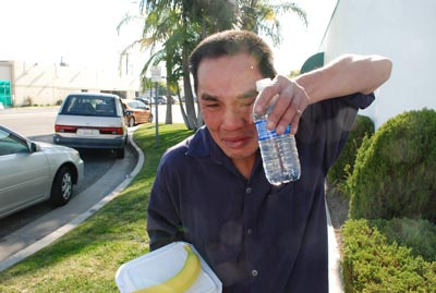 Vào lúc 12 giờ trưa khởi đầu tiếp đón khách không nhà, có khoảng độ 7 người đã tới nhận lãnh phần ăn. Ða số là những người không nhà thường qua đêm tại các khu phố quanh trung khu Little Saigon. Một người không nhà, anh Long Huỳnh vừa khóc vừa nói với chúng tôi: “Em khổ lắm. Vợ mất vì bạo bệnh năm ngoái, tiếp đến lại bị thất nghiệp không thể nào nuôi nổi đứa con trai 3 tuổi nên em đã cho vào cô nhi viện, cứ 3 tháng thì được thăm một lần, nhưng vì buồn quá em như người mất hồn, đôi lúc có say sưa nên cô nhi viện cũng không cho đến thăm nữa. Khổ lắm anh ơi!”
