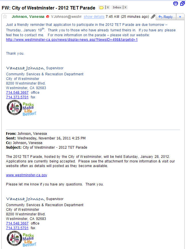 The 2012 TET Parade, hosted by the City of Westminster, will be held Saturday, January 28, 2012. Applications are currently being accepted. Please see the attachment for more information & visit our website often as details will posted as they become available.