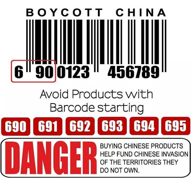 Nên tránh mua sản phẩm Trung Quốc mang Mã vạch từ "690" đến "695 "như cảnh báo trong hình trên của Báo chí, Truyền thông Hoa Kỳ.