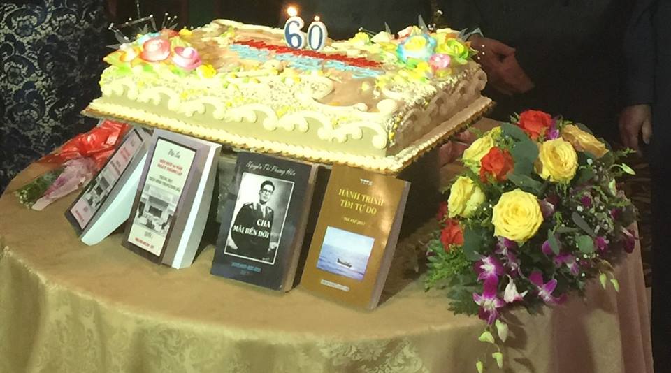 Tôi thấy trên sân khấu có dòng chữ chớp chớp "Kỷ Niệm 60 năm trường Trung Học Trần...", gần sân khấu có cái bánh lớn và trưng 4 cuốn sách của 4 tác giả.