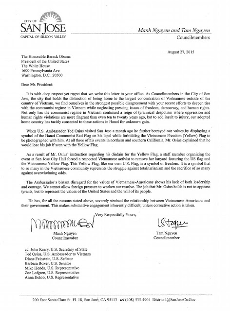 It is with deep respect yet regret that we write this letter to your office. As Councilmembers in the City of San Jose, the city that holds the distinction of being home to the largest concentration of Vietnamese outside of the country of Vietnam, we find ourselves in the strongest possible disagreement with your recent efforts to deepen ties with the communist regime in Vietnam while neglecting pressing issues of freedom, democracy, and human rights. Not only has the communist regime in Vietnam continued a reign of tyrannical despotism where oppression and human rights violations are more flagrant than even ten to twenty years ago, but to add insult to injury, our adopted home country has tacitly consented to these actions in Hanoi for unknown gain.