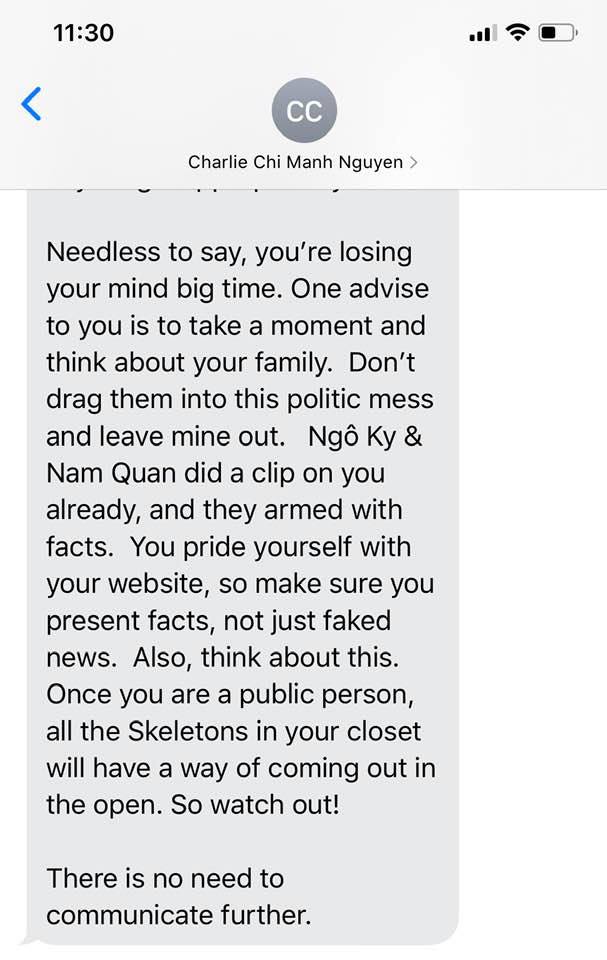 - Mời xem bằng chứng Nguyễn Mạnh Chí hăm dọa tôi là “Ngô Kỷ và Nam Quan sẽ làm clip bươi móc đời tư của tôi với đầy đủ bằng chứng" ("Ngo Ky and Nam Quan did clip on you already. They armed with facts"). Nguyễn Mạnh Chí là loại người gì đây hả đồng hương? mà lại bỏ tiền ra đi mướn những người quá kém để bươi móc vào đời tư của người khác.