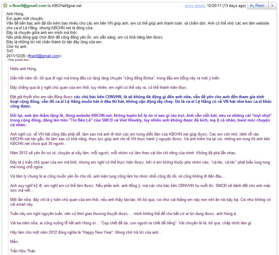 | - 2 Emails "chiêu h?i" NPH 'd?p c?, ?óng web': (email ngày 26-12, sau khi NPH thua ki?n ngày 21-12, ??i b?i t? t?i, im re trên KBCHN...) |