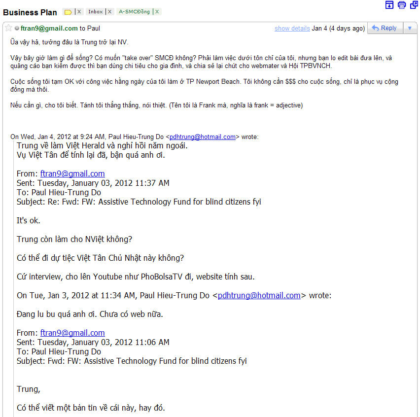 - D??i ?ây là n?i dung 2 cái emails c?a Frank Tr?n g?i NPH ngày 26/12 mà NPH ?ã ??c trên Ph? BolsaTV (lên Youtube ngày 7-1-2012), và cái email c?a Frank Tr?n g?i nhà báo Trung ?? ngày 4-1-2012 (tr??c khi Ph? BolsaTV ??a Ph?ng v?n NPH lên Youtube)